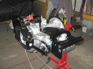 Remskivans kåpa på plats tillsammans med bakre motorupphängningen. Oljepåfyllnadsröret är provmonterat, får se hur det passar med nya avgasstystemet.